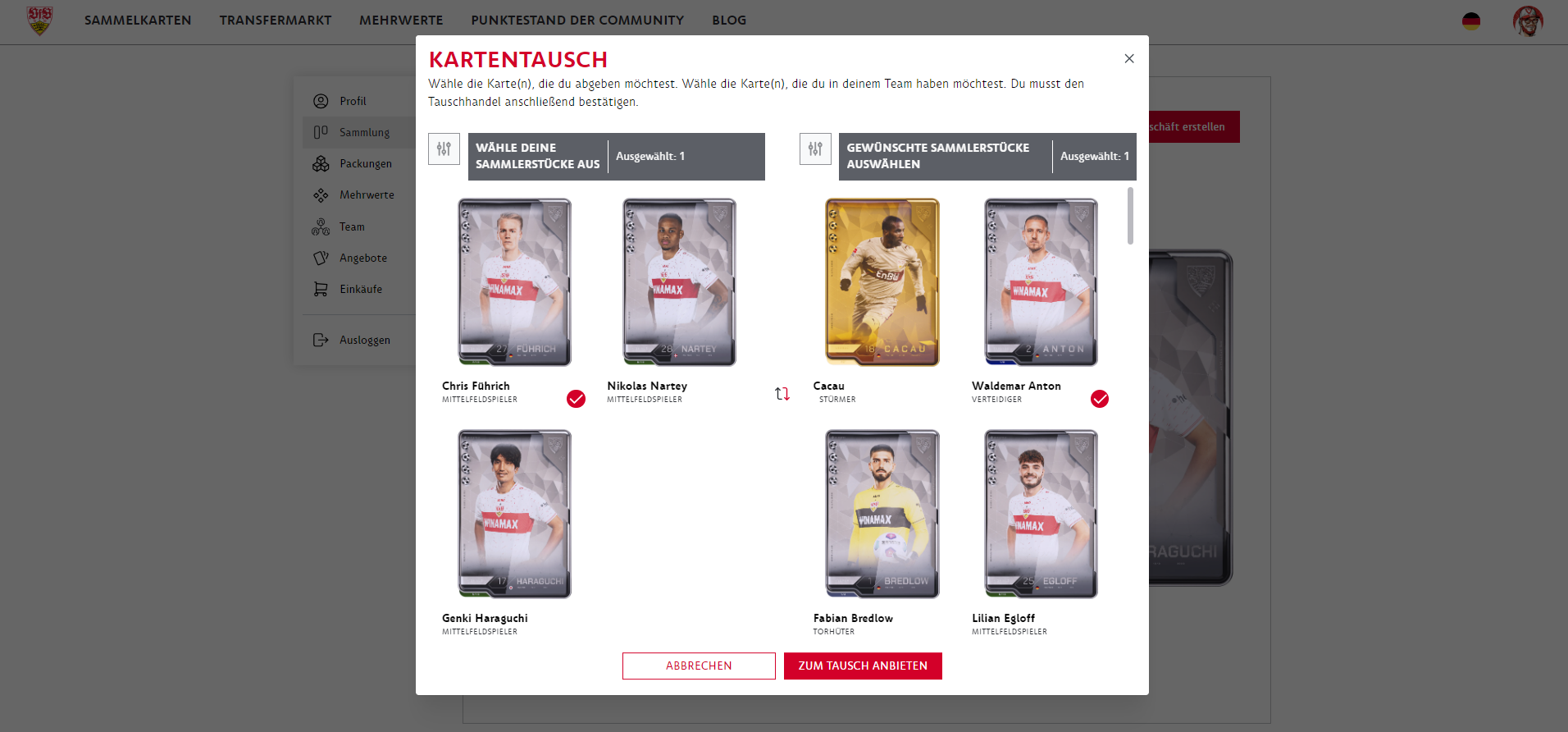 You can swap cards via the marketplace. You can find a trade partner here via "Trade Collectibles". As long as your card is on offer, it cannot be used for challenges and will temporarily not be visible in your collection. Important: Only cards that are not in your collection can be offered. We will notify you when a transfer has been successfully completed.