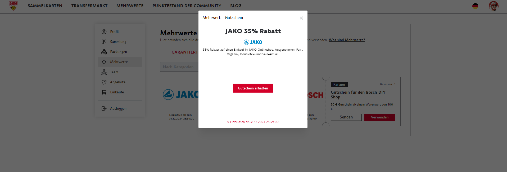 Vouchers from partners can be redeemed directly by clicking on them. The code will then be displayed and also sent to you by e-mail.