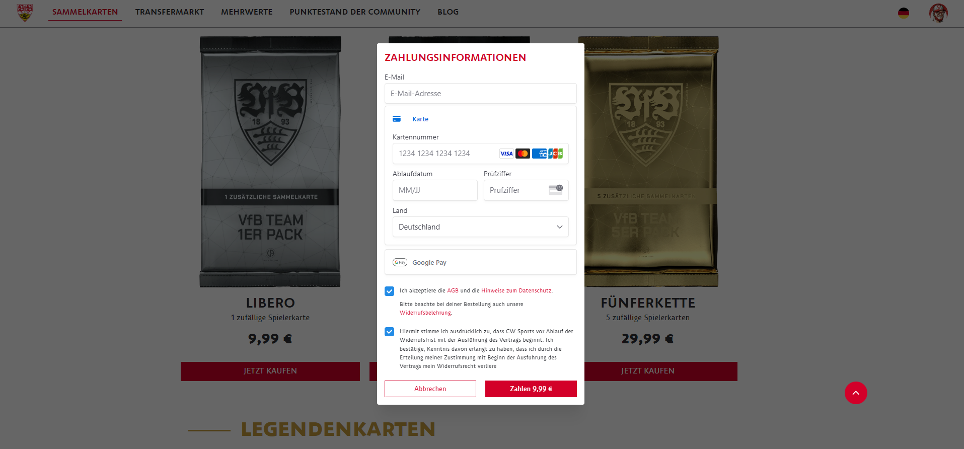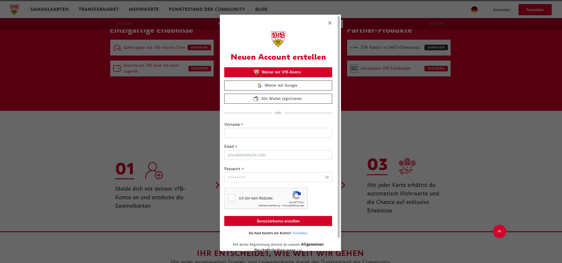 To purchase the cards and use the challenges, you must first register or log in. You have the following options: by email directly on our Collectibles website, via your existing VfB online shop login or your Google account. For the crypto community, we also offer login via one of the common wallets.